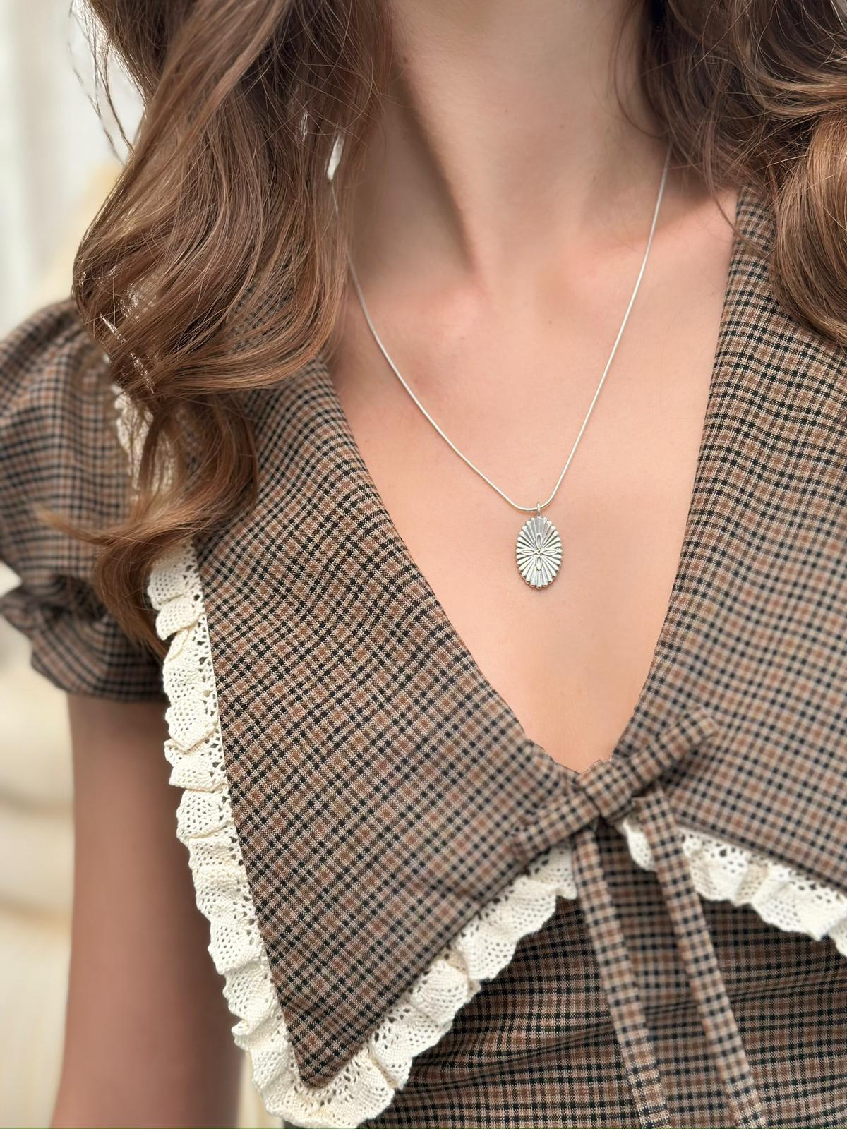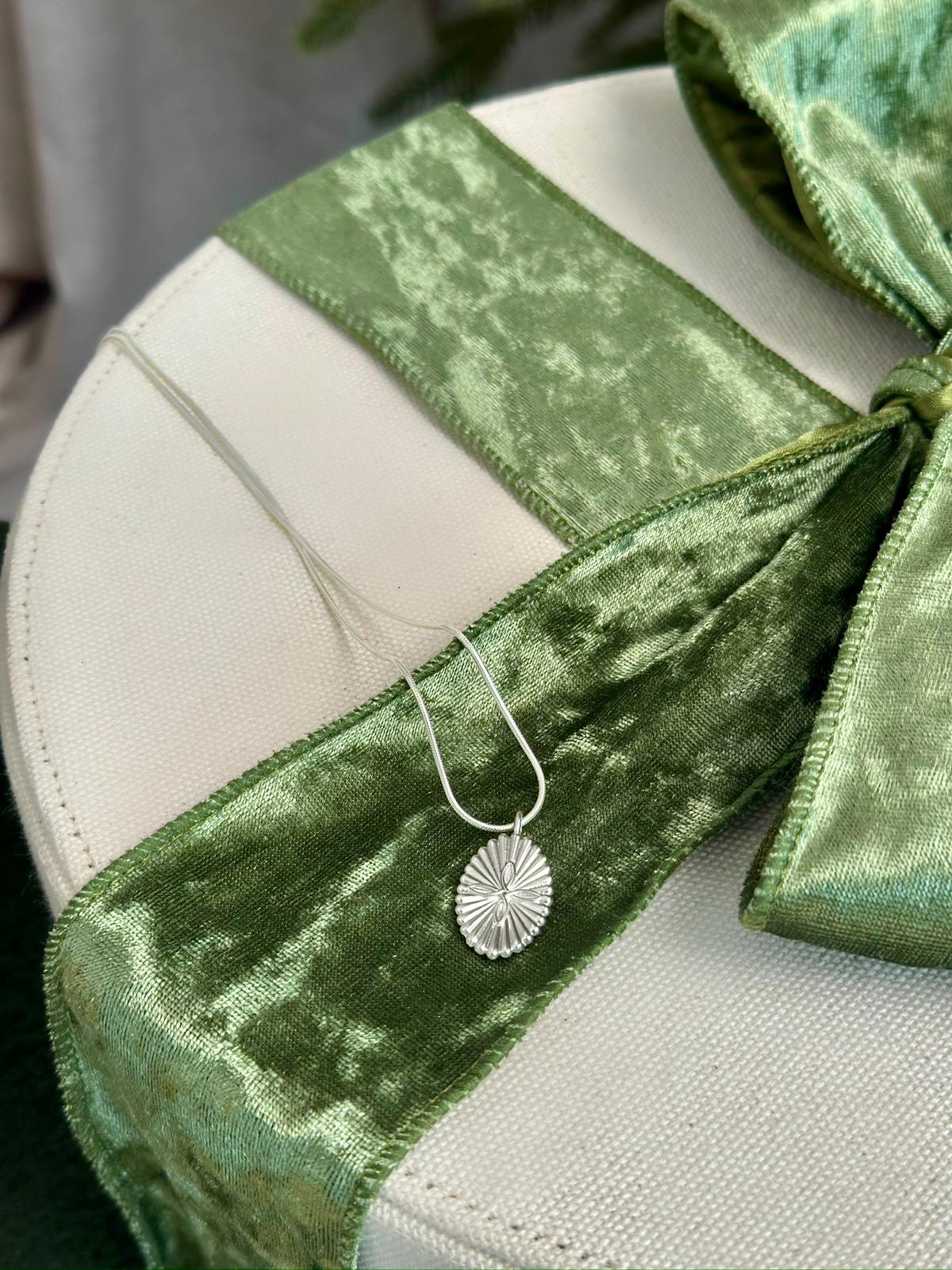 Medalion o wymiarach około 2 x 1,5 cm zdobi symbol Węzła Szczęścia. To znak początku i końca, który oznacza wieczność oraz nierozerwalność. Uważa się, że chroni przed negatywną energią, klątwami i fałszem. Przyciąga życzliwych ludzi oraz wzmacnia miłość i przyjaźń. Jest również symbolem szczęścia i bogactwa.