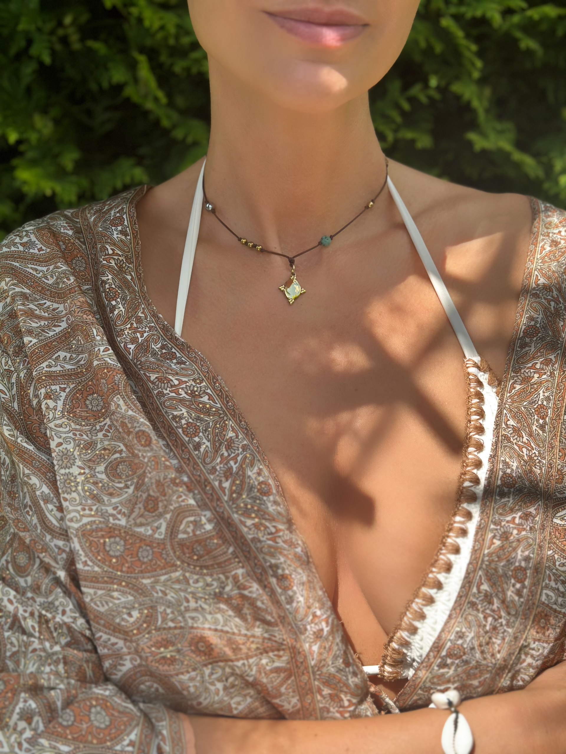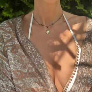 Naszyjnik HIPI z naturalnych kamieni na regulowanym sznureczku, ozdobiony pozłacanym medalionem z możliwością graweru i logo Ami Bijoux. Styl boho z nutą elegancji.
